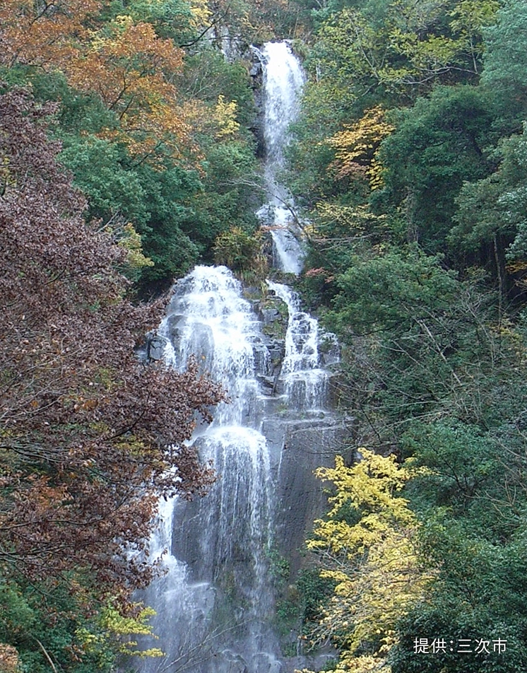 広島県三次市にある常清滝は、「日本の滝百選」にも選ばれた名瀑。岩肌を三段に分かれて流れ落ちる優美な姿と、四季折々に変わる自然の表情を楽しめます。