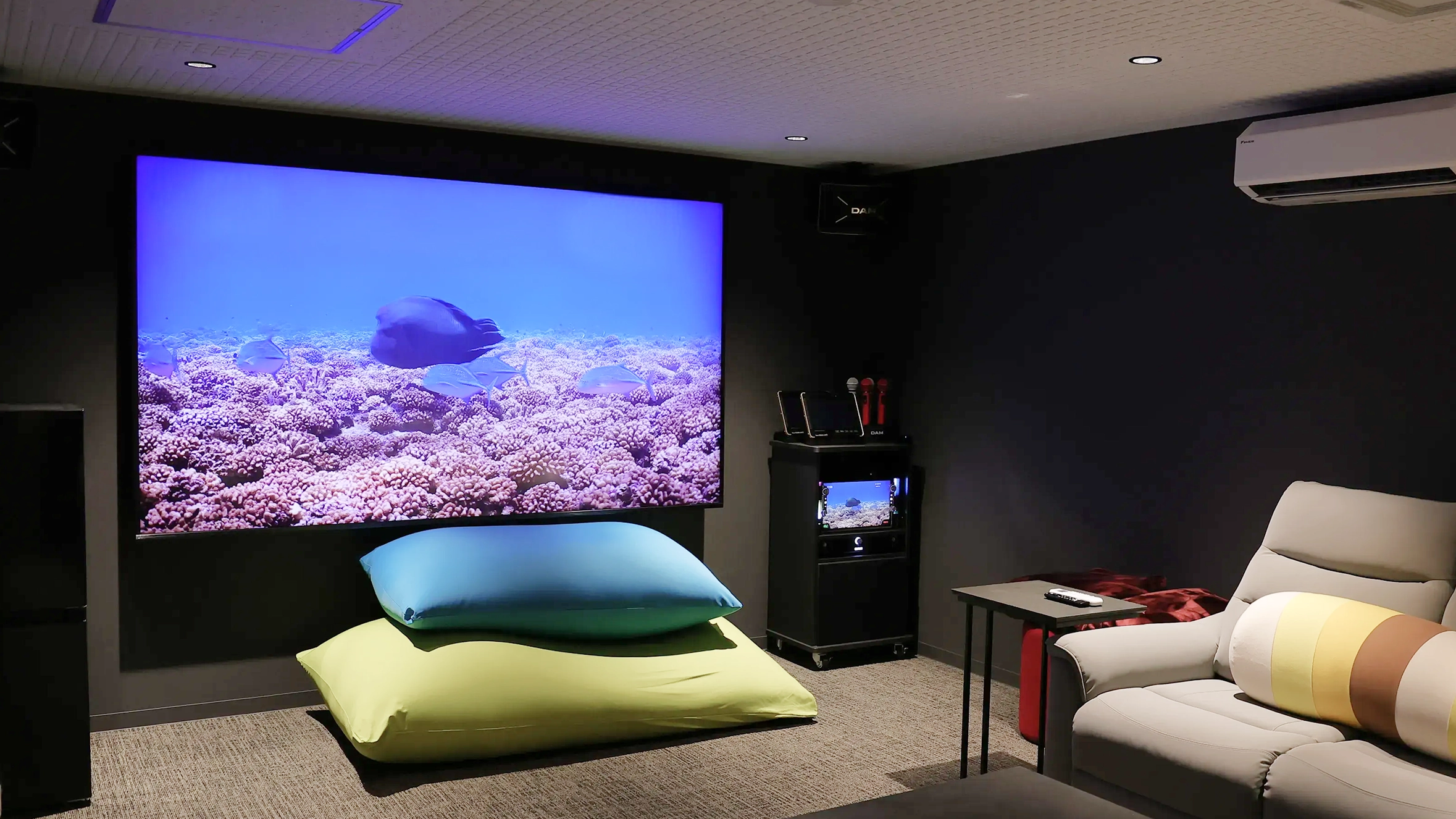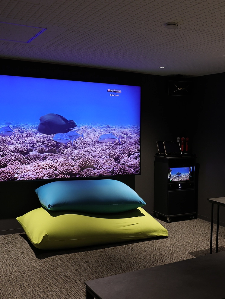 専用のカラオケ・シアタールームには、ソファやヨギボーを配置し、くつろぎながら歌を楽しめます。