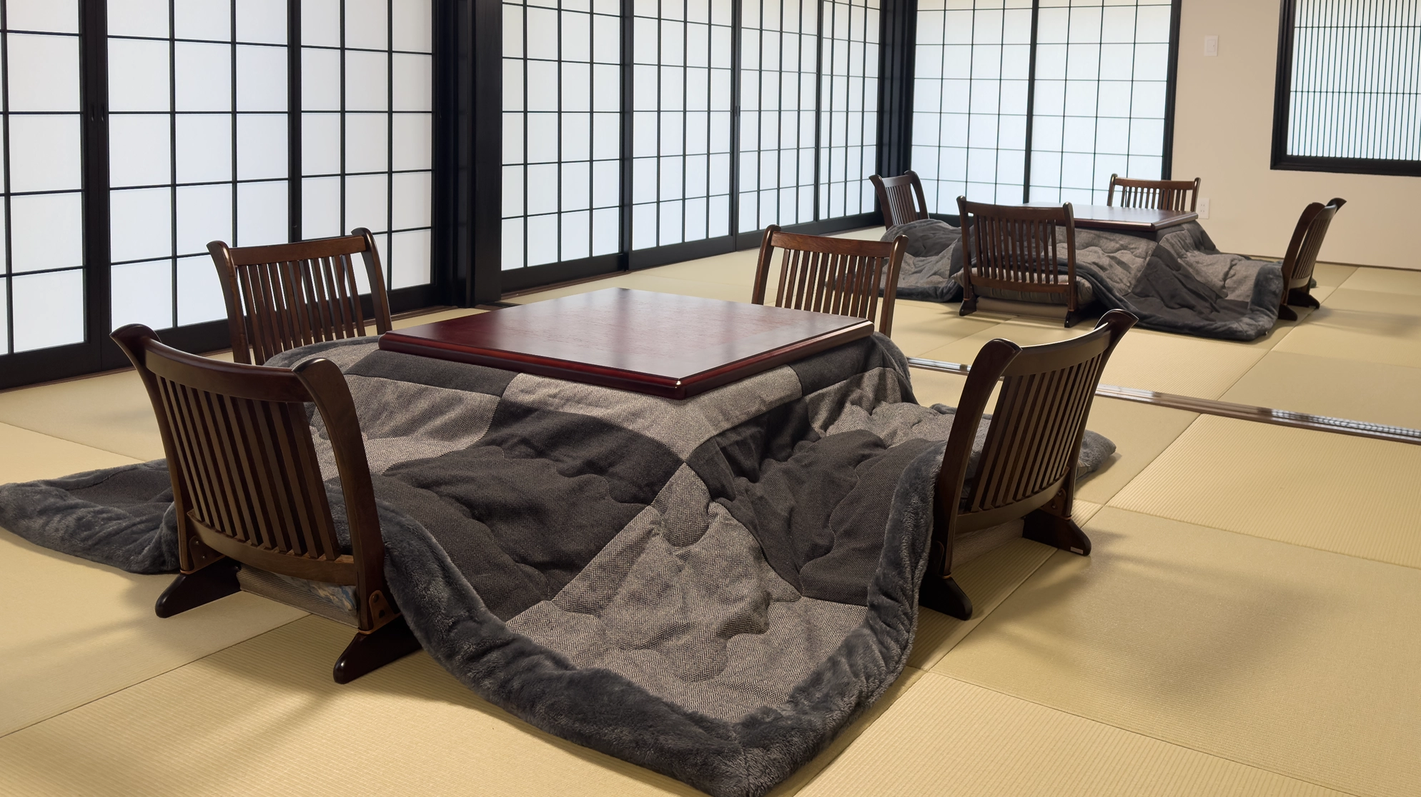 床の間を備えた、趣ある和室。畳の香りとやわらかな静けさに包まれ、掘りごたつを囲んで語らいのひとときを楽しんだり、布団を敷いてゆっくりとお休みいただけます。